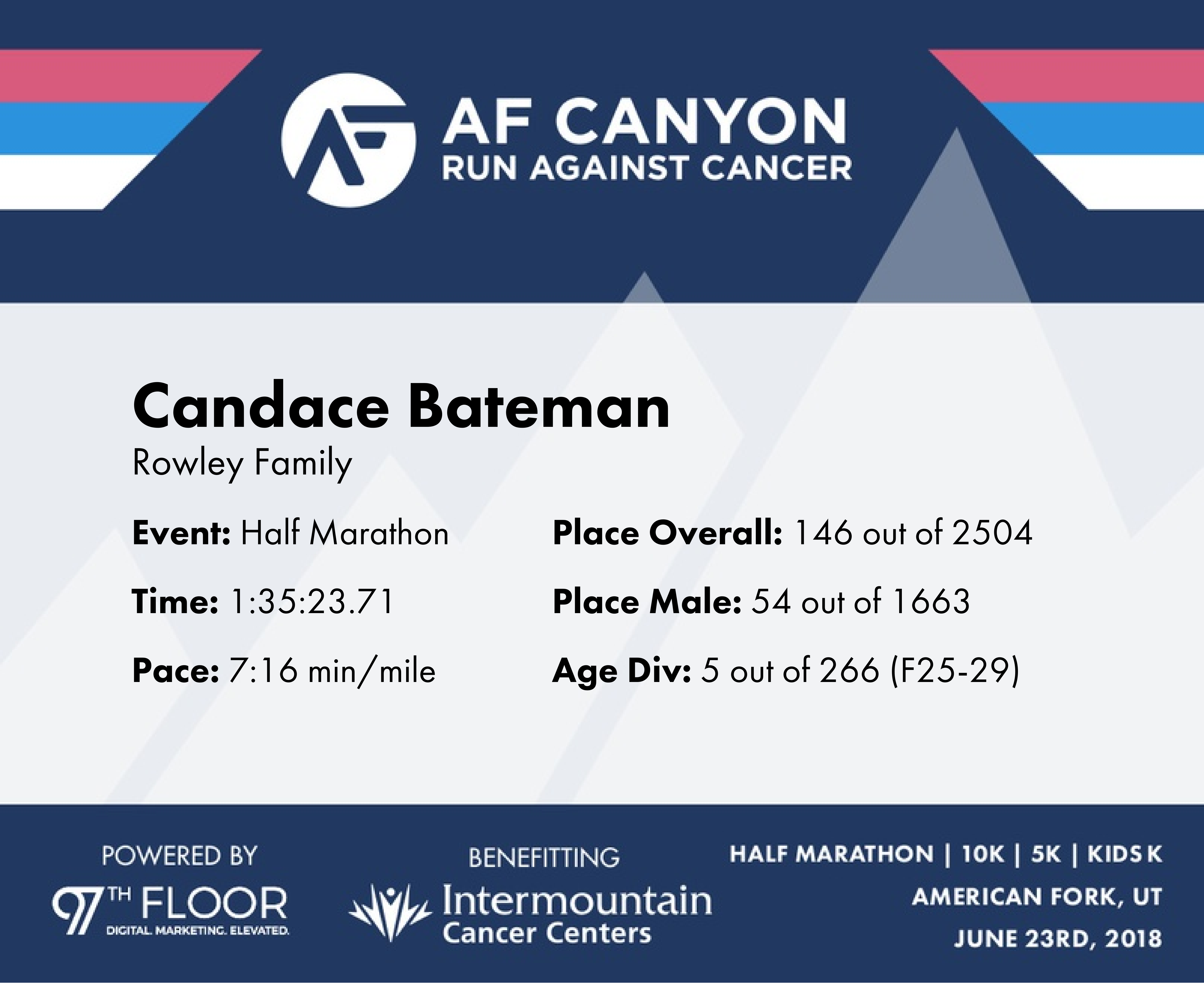| Finish | 13.1 | 1:35:24 | 7:16/miles | 6.55 | 48:12 | 7:21/miles | 146 | 54 F | 5 F25-29 |