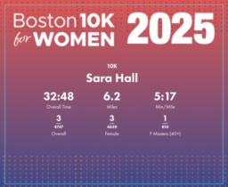 Outstanding Performance with Steady Pace and Top Placement Sara Hall delivered an impressive performance at the 2025 Boston 10K for Women, navigating the 6.2-mile course with precision and consistency. Her opening mile clocked in at 5:21, setting a strong pace that she maintained throughout. Hall's splits varied slightly but remained consistent, with her fastest mile at 5:15. Her ability to adjust and maintain a sub-5:20 pace is commendable, showcasing her strategic planning and execution. Hall's overall time of 32:48 earned her a commendable 3rd place overall and in the female category, while securing 1st in the Masters (40+) division. This demonstrates her skill in competing at a high level across various age groups. Each mile contributed smoothly to her overall ranking against a field of 5,663 participants. For future races, maintaining this steady pace will likely ensure continued success and potential improvements in overall placement.