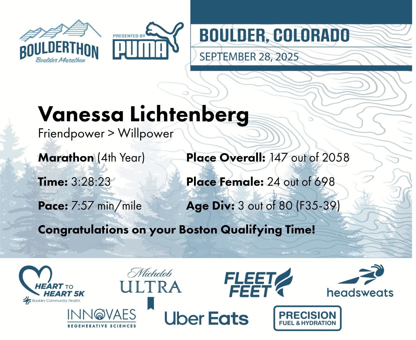 Date: Sept. 28, 2025 Participant: Vanessa Lichtenberg #13080 Race: 2025 Boulderthon Marathon Distance: 26.2 miles Weather: Perfect running weather with temperatures in the 50's to 70's and nice cloud cover