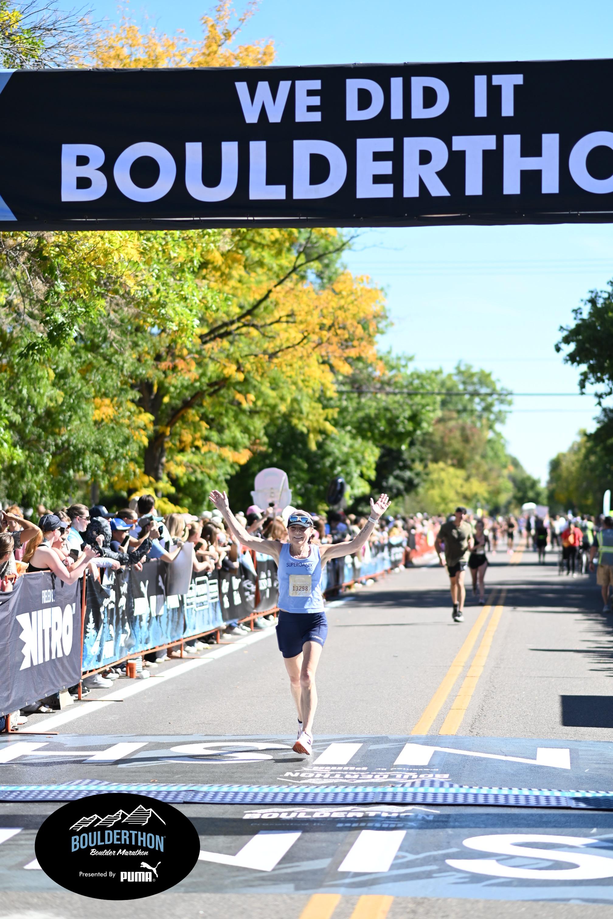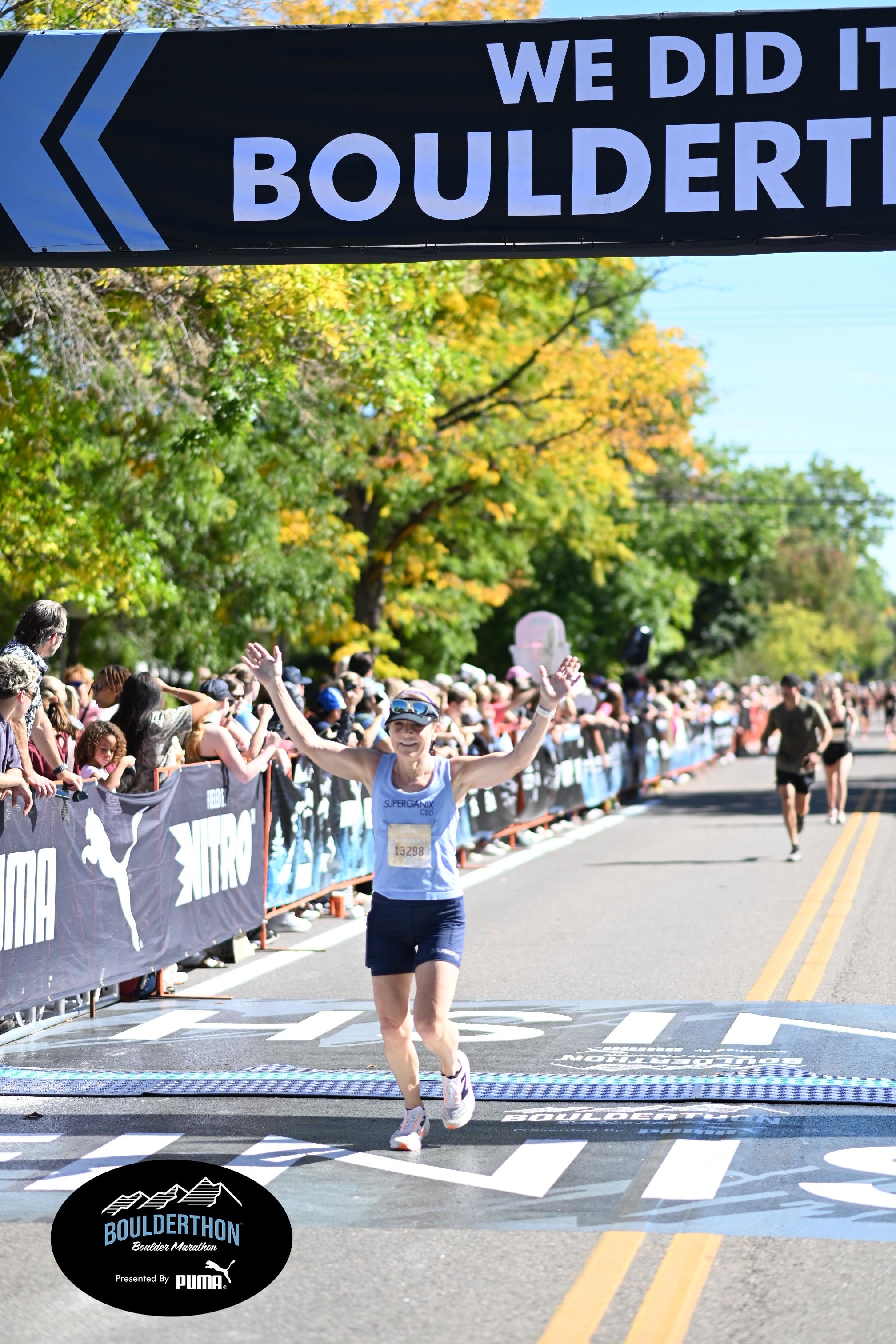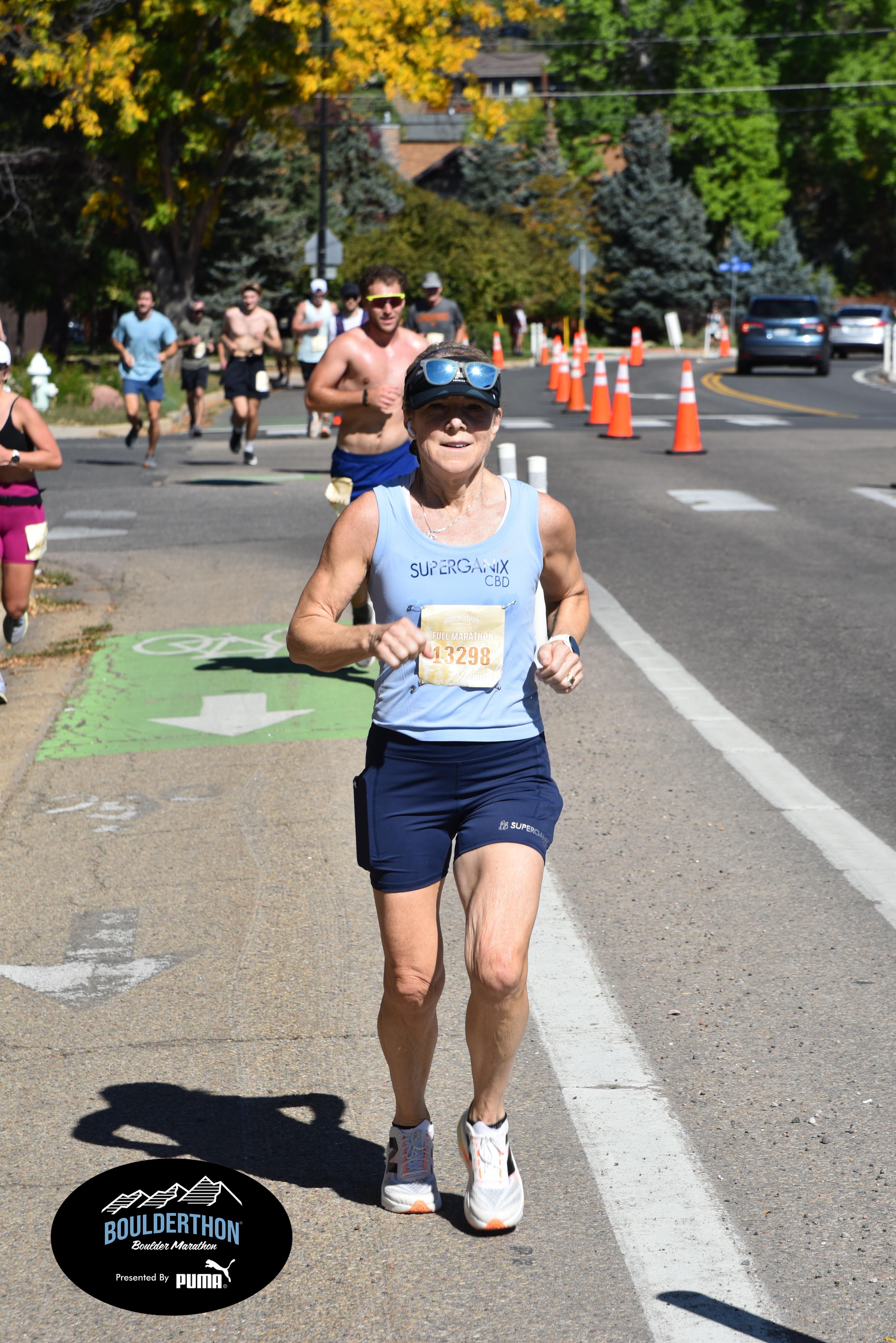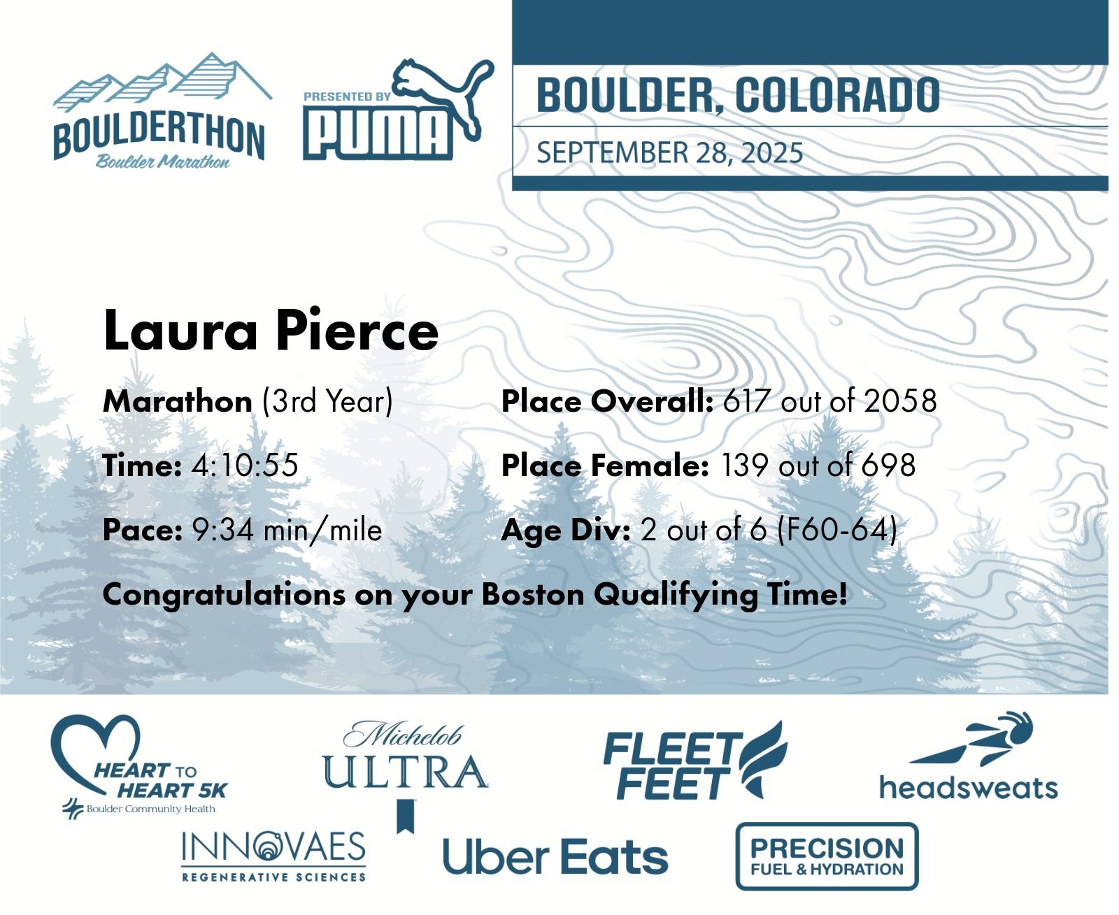 Date: Sept. 28, 2025 Participant: Laura Pierce #13298 Race: 2025 Boulderthon Marathon Distance: 26.2 miles Weather: Perfect running weather with temperatures in the 50's to 70's and nice cloud cover