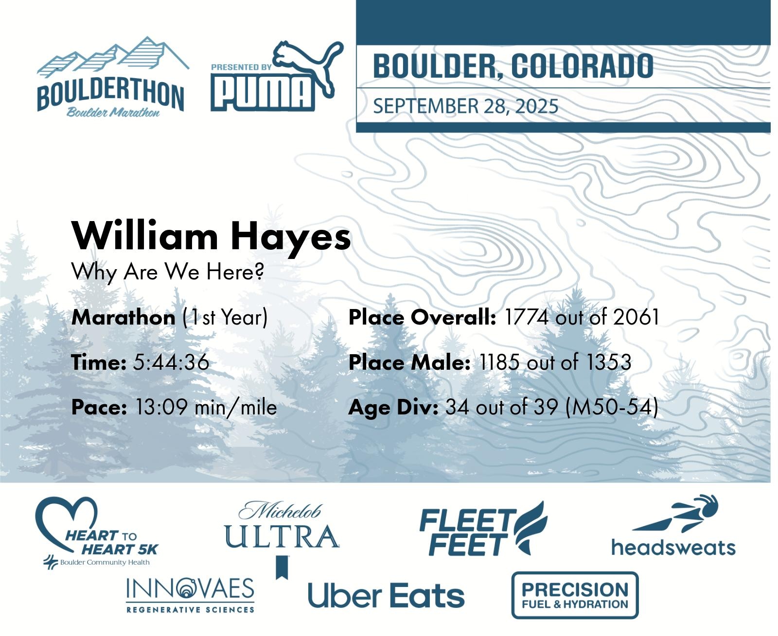 Date: Sept. 28, 2025 Participant: William Hayes #10361 Race: 2025 Boulderthon Marathon Distance: 26.2 miles Weather: Perfect running weather with temperatures in the 50's to 70's and nice cloud cover