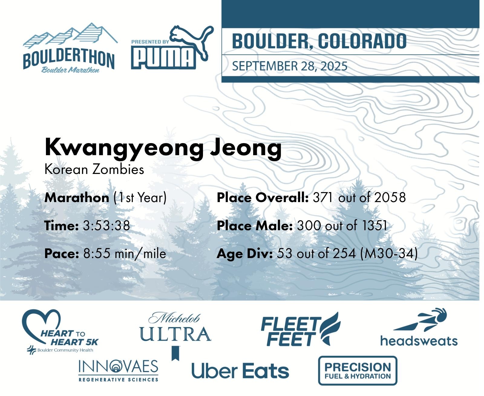 Date: Sept. 28, 2025 Participant: Kwangyeong Jeong #11924 Race: 2025 Boulderthon Marathon Distance: 26.2 miles Weather: Perfect running weather with temperatures in the 50's to 70's and nice cloud cover