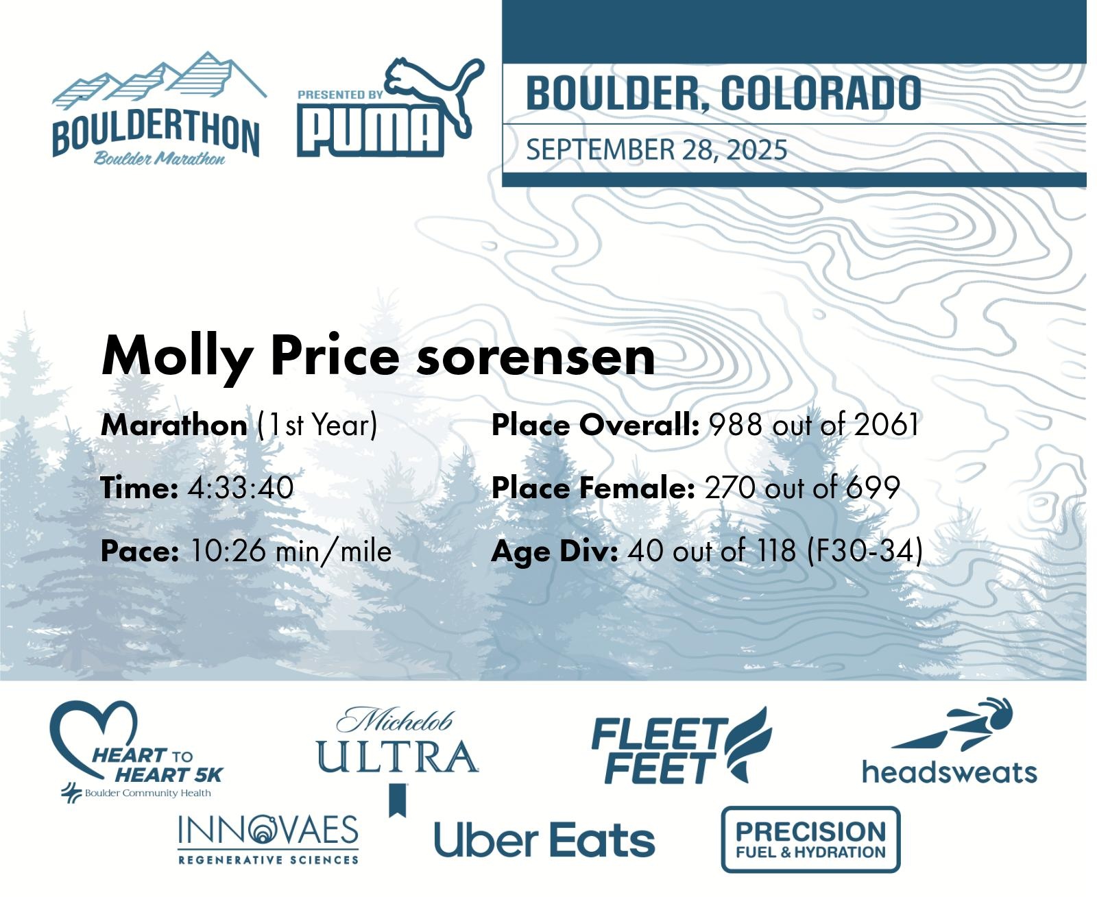 Date: Sept. 28, 2025 Participant: Molly Price sorensen #11761 Race: 2025 Boulderthon Marathon Distance: 26.2 miles Weather: Perfect running weather with temperatures in the 50's to 70's and nice cloud cover