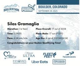 Date: Sept. 28, 2025 Participant: Silas Gramaglia #11085 Race: 2025 Boulderthon Marathon Distance: 26.2 miles Weather: Perfect running weather with temperatures in the 50's to 70's and nice cloud cover