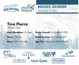Date: Sept. 28, 2025 Participant: Tina Pierre #23136 Race: 2025 Boulderthon Half Marathon Distance: 13.1 miles Weather: Perfect running weather with temperatures in the 50's to 70's and nice cloud cover