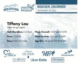 Date: Sept. 28, 2025 Participant: Tiffany Lau #22731 Race: 2025 Boulderthon Half Marathon Distance: 13.1 miles Weather: Perfect running weather with temperatures in the 50's to 70's and nice cloud cover