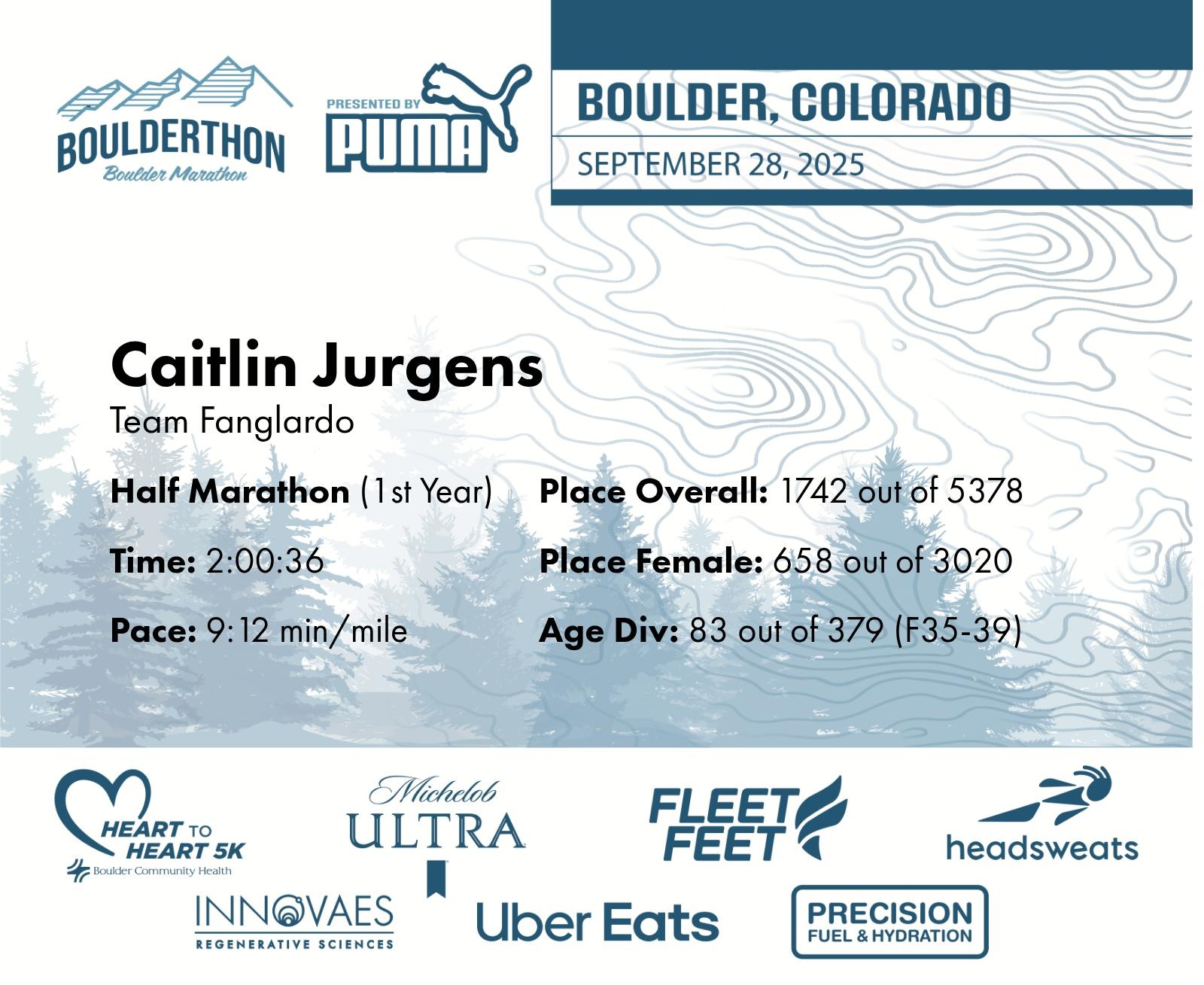 Date: Sept. 28, 2025 Participant: Caitlin Jurgens #23701 Race: 2025 Boulderthon Half Marathon Distance: 13.1 miles Weather: Perfect running weather with temperatures in the 50's to 70's and nice cloud cover