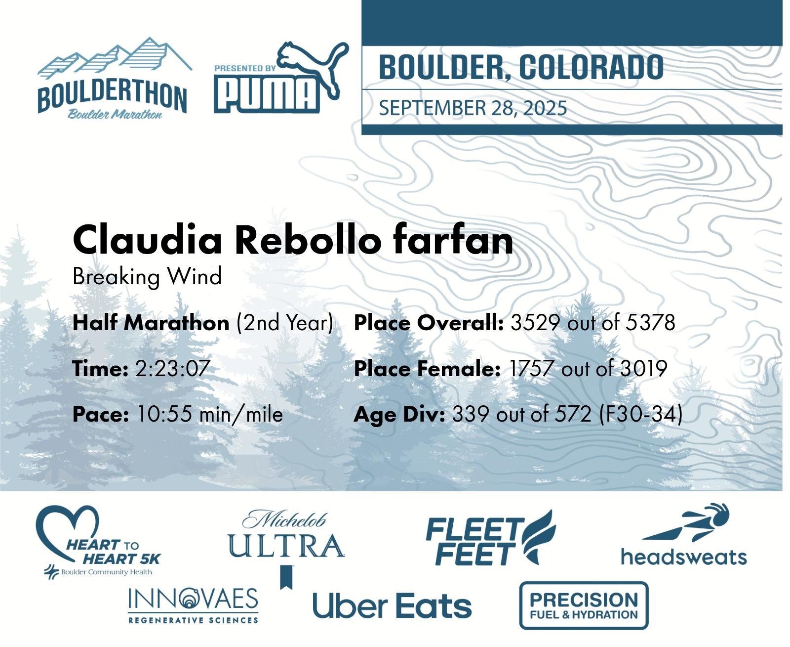 Date: Sept. 28, 2025 Participant: Claudia Rebollo farfan #25682 Race: 2025 Boulderthon Half Marathon Distance: 13.1 miles Weather: Perfect running weather with temperatures in the 50's to 70's and nice cloud cover