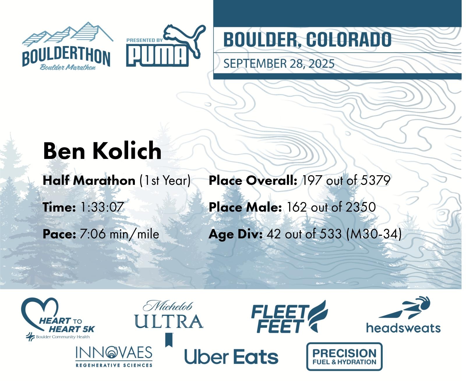 Date: Sept. 28, 2025 Participant: Ben Kolich #26192 Race: 2025 Boulderthon Half Marathon Distance: 13.1 miles Weather: Perfect running weather with temperatures in the 50's to 70's and nice cloud cover
