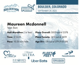 Date: Sept. 28, 2025 Participant: Maureen Mcdonnell #22198 Race: 2025 Boulderthon Half Marathon Distance: 13.1 miles Weather: Perfect running weather with temperatures in the 50's to 70's and nice cloud cover