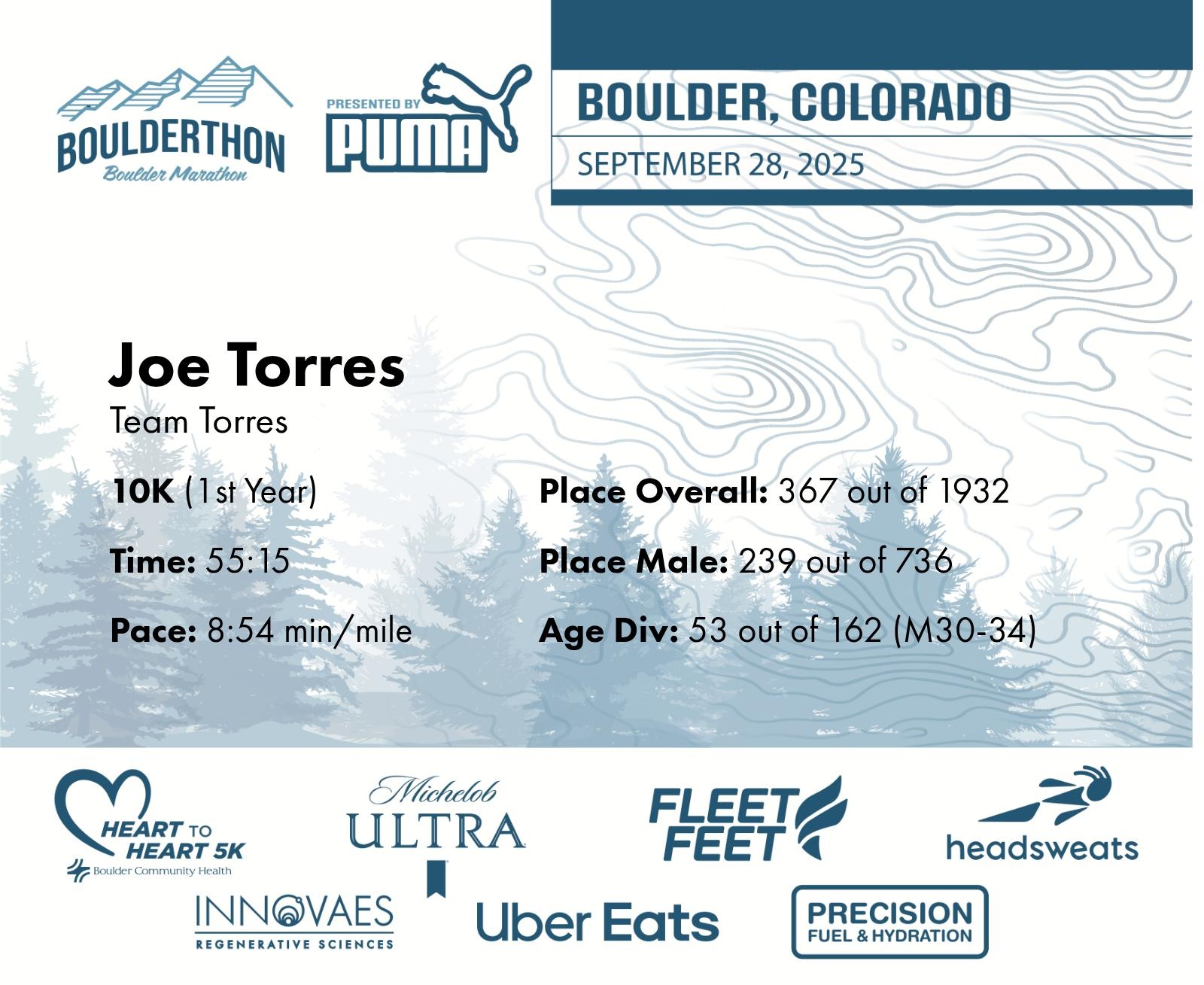 Date: Sept. 28, 2025 Participant: Joe Torres #31606 Race: 2025 Boulderthon 10K Distance: 6.2 miles Weather: Perfect running weather with temperatures in the 50's to 70's and nice cloud cover