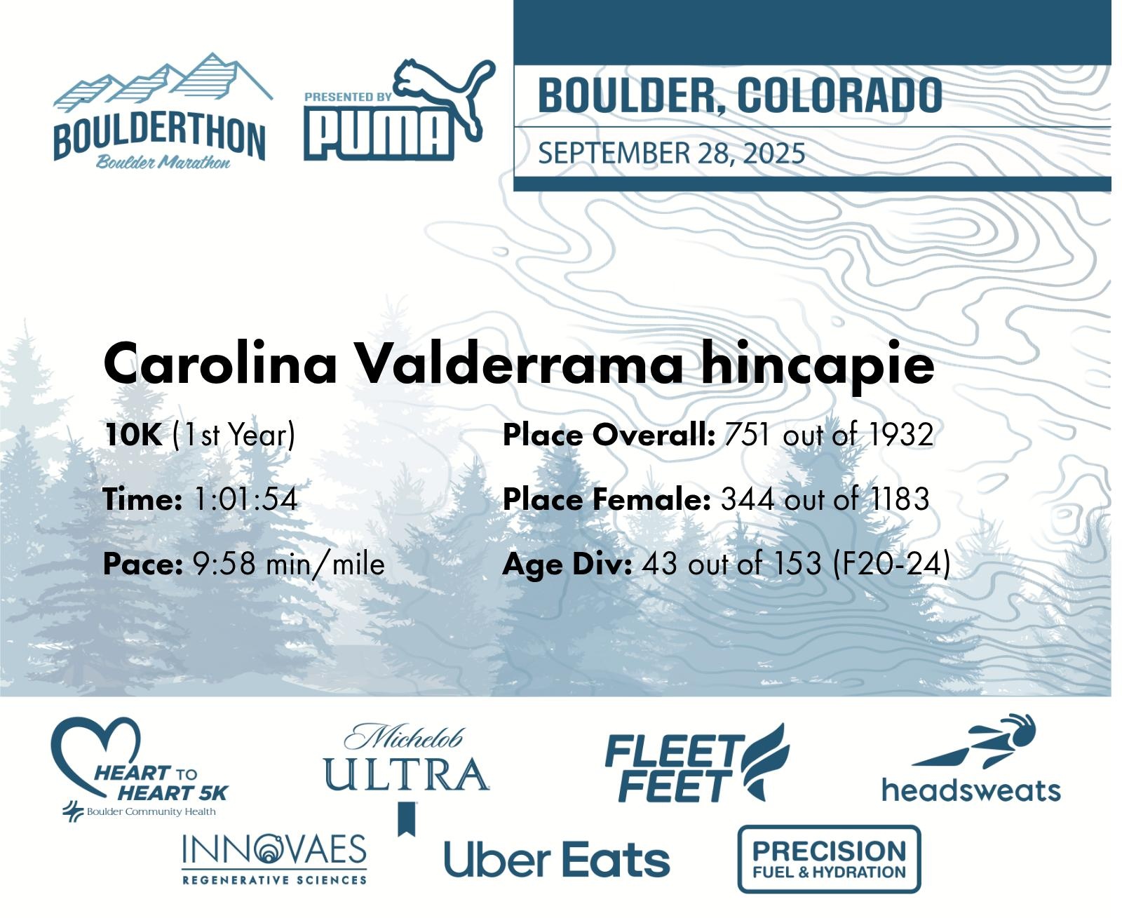 Date: Sept. 28, 2025 Participant: Carolina Valderrama hincapie #32326 Race: 2025 Boulderthon 10K Distance: 6.2 miles Weather: Perfect running weather with temperatures in the 50's to 70's and nice cloud cover