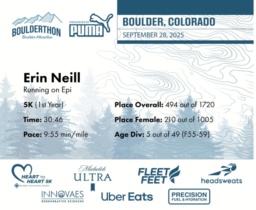 Date: Sept. 28, 2025 Participant: Erin Neill #42081 Race: 2025 Boulderthon 5K Distance: 3.1 miles Weather: Perfect running weather with temperatures in the 50's to 70's and nice cloud cover