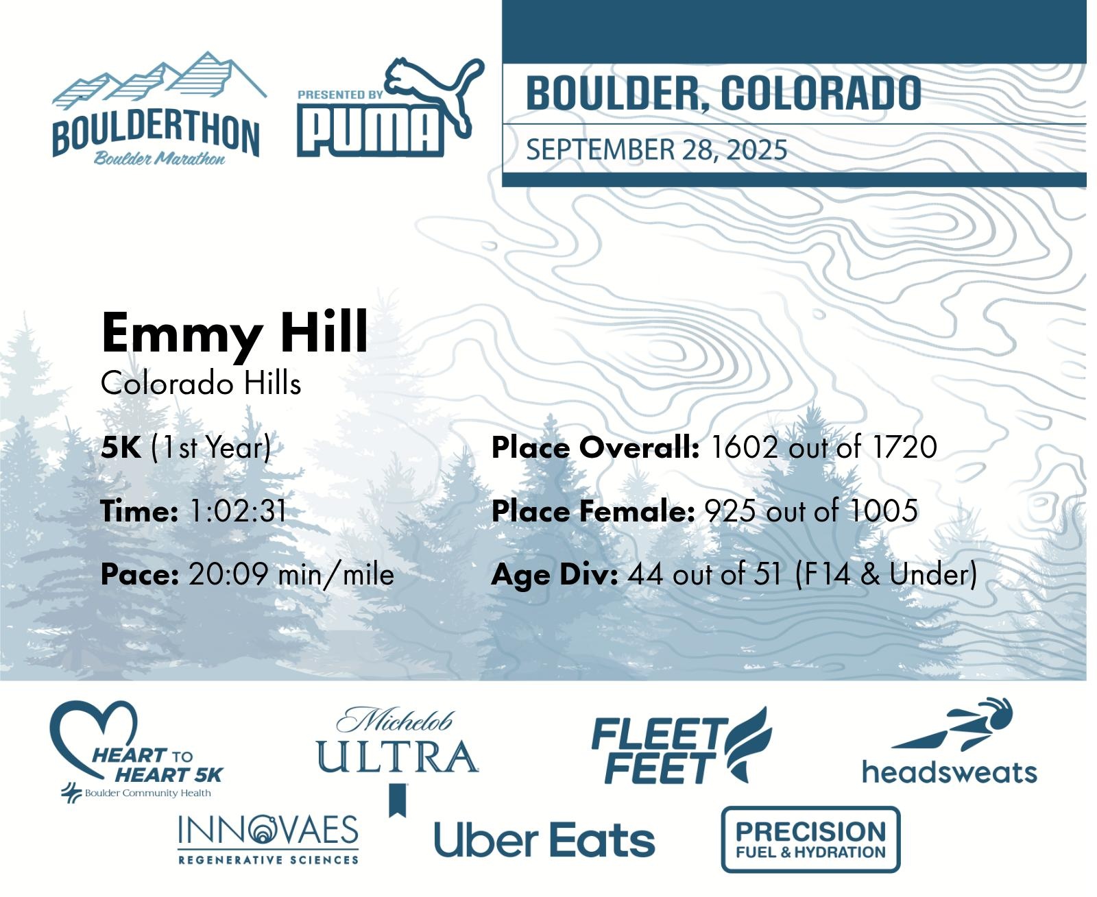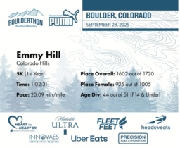 Date: Sept. 28, 2025 Participant: Emmy Hill #41636 Race: 2025 Boulderthon 5K Distance: 3.1 miles Weather: Perfect running weather with temperatures in the 50's to 70's and nice cloud cover