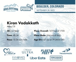 Date: Sept. 28, 2025 Participant: Kiran Vadakkath #42820 Race: 2025 Boulderthon 5K Distance: 3.1 miles Weather: Perfect running weather with temperatures in the 50's to 70's and nice cloud cover