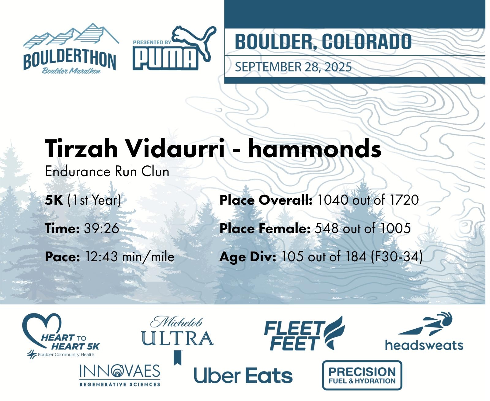 Date: Sept. 28, 2025 Participant: Tirzah Vidaurri - hammonds #42545 Race: 2025 Boulderthon 5K Distance: 3.1 miles Weather: Perfect running weather with temperatures in the 50's to 70's and nice cloud cover