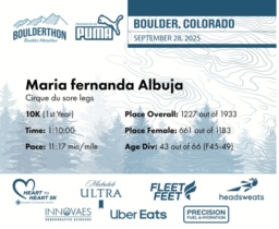 Date: Sept. 28, 2025 Participant: Maria fernanda Albuja #33026 Race: 2025 Boulderthon 10K Distance: 6.2 miles Weather: Perfect running weather with temperatures in the 50's to 70's and nice cloud cover