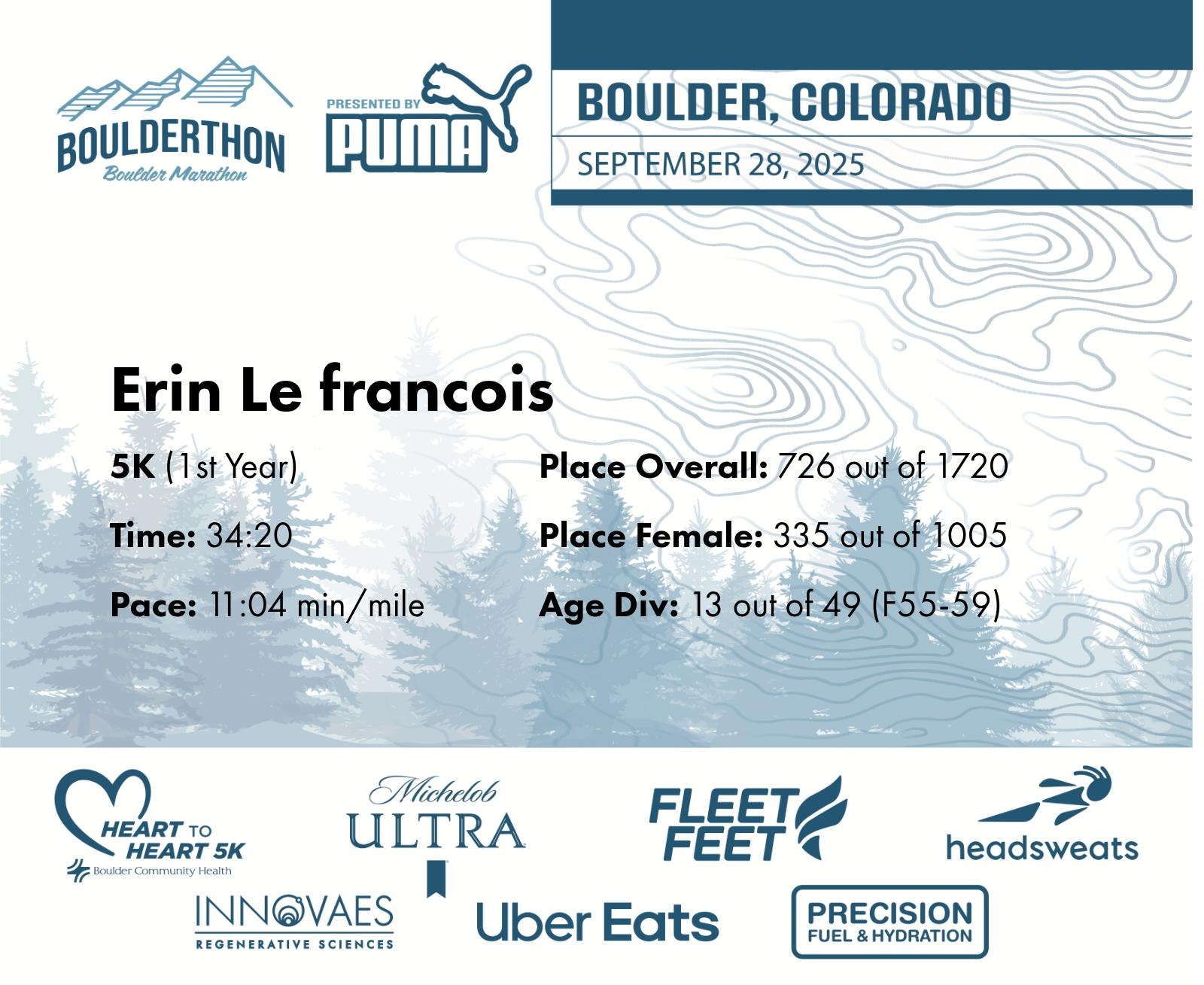 Date: Sept. 28, 2025 Participant: Erin Le francois #42697 Race: 2025 Boulderthon 5K Distance: 3.1 miles Weather: Perfect running weather with temperatures in the 50's to 70's and nice cloud cover