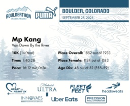 Date: Sept. 28, 2025 Participant: Mp Kang #33240 Race: 2025 Boulderthon 10K Distance: 6.2 miles Weather: Perfect running weather with temperatures in the 50's to 70's and nice cloud cover