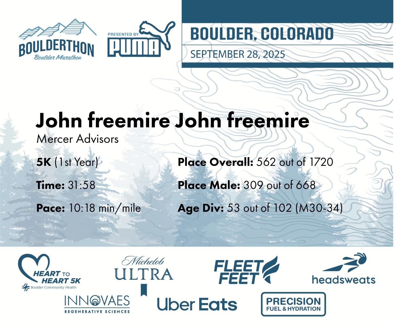 Date: Sept. 28, 2025 Participant: John freemire John freemire #41117 Race: 2025 Boulderthon 5K Distance: 3.1 miles Weather: Perfect running weather with temperatures in the 50's to 70's and nice cloud cover