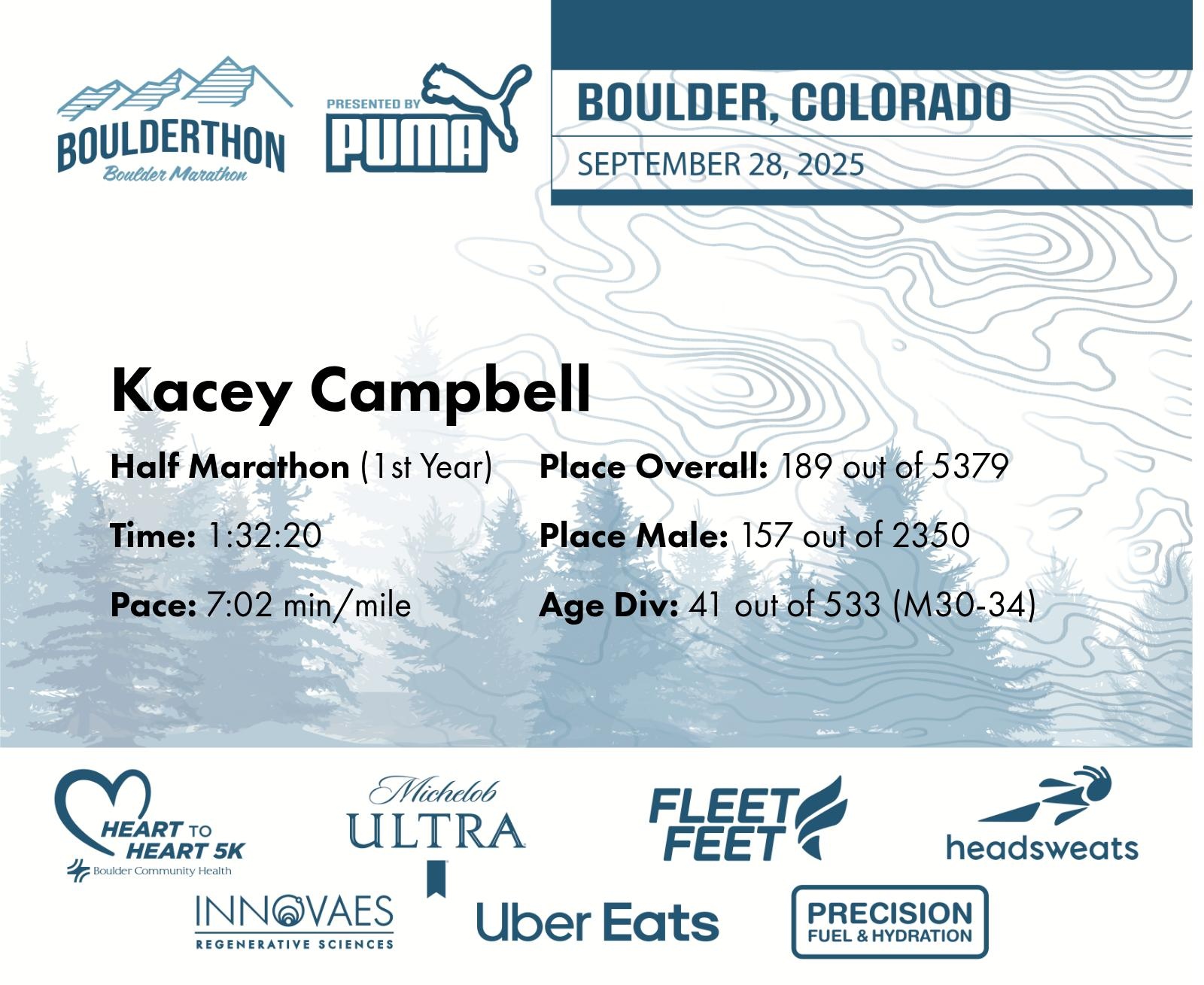Date: Sept. 28, 2025 Participant: Kacey Campbell #22303 Race: 2025 Boulderthon Half Marathon Distance: 13.1 miles Weather: Perfect running weather with temperatures in the 50's to 70's and nice cloud cover