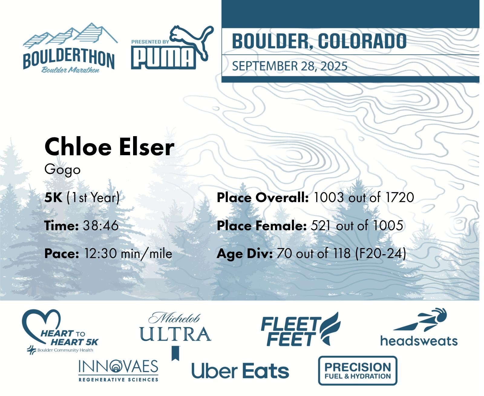 Date: Sept. 28, 2025 Participant: Chloe Elser #41337 Race: 2025 Boulderthon 5K Distance: 3.1 miles Weather: Perfect running weather with temperatures in the 50's to 70's and nice cloud cover