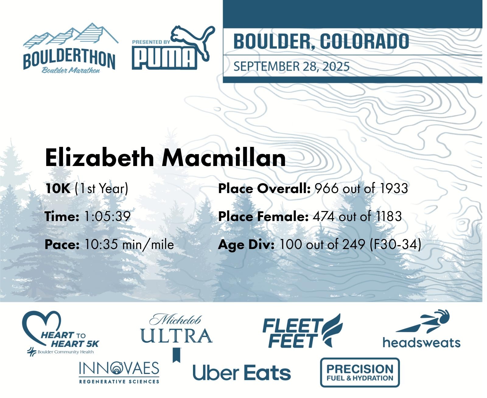 Date: Sept. 28, 2025 Participant: Elizabeth Macmillan #31475 Race: 2025 Boulderthon 10K Distance: 6.2 miles Weather: Perfect running weather with temperatures in the 50's to 70's and nice cloud cover