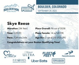 Date: Sept. 28, 2025 Participant: Skye Reese #12892 Race: 2025 Boulderthon Marathon Distance: 26.2 miles Weather: Perfect running weather with temperatures in the 50's to 70's and nice cloud cover