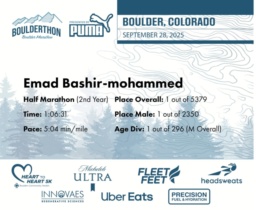 Date: Sept. 28, 2025 Participant: Emad Bashir-mohammed #20014 Race: 2025 Boulderthon Half Marathon Distance: 13.1 miles Weather: Perfect running weather with temperatures in the 50's to 70's and nice cloud cover