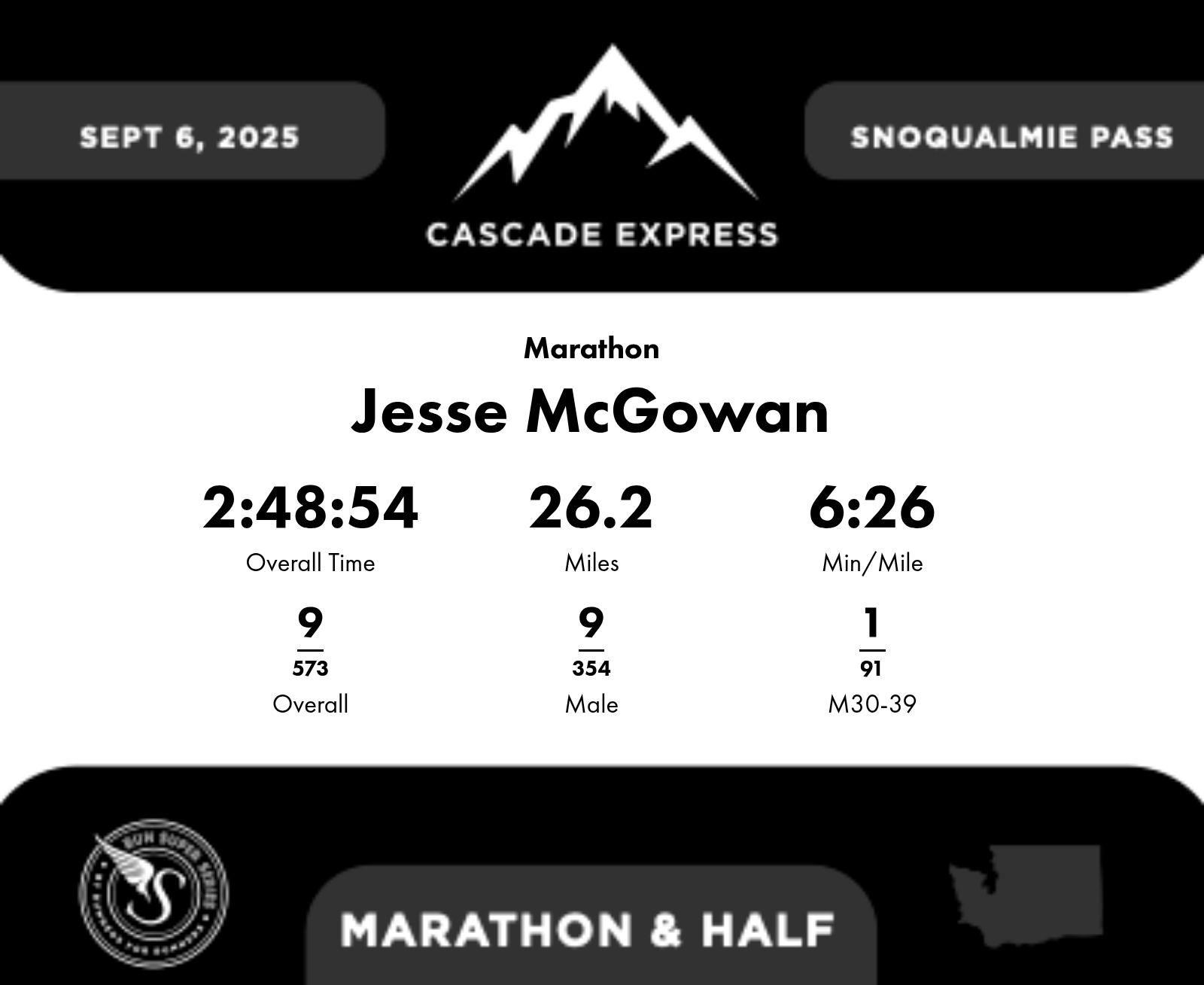 | Finish | 26.2 | 2:48:54 | 6:26/miles | 0.2 | 1:14 | 6:09/miles | 9 | 9 M | 1 M30-39 |