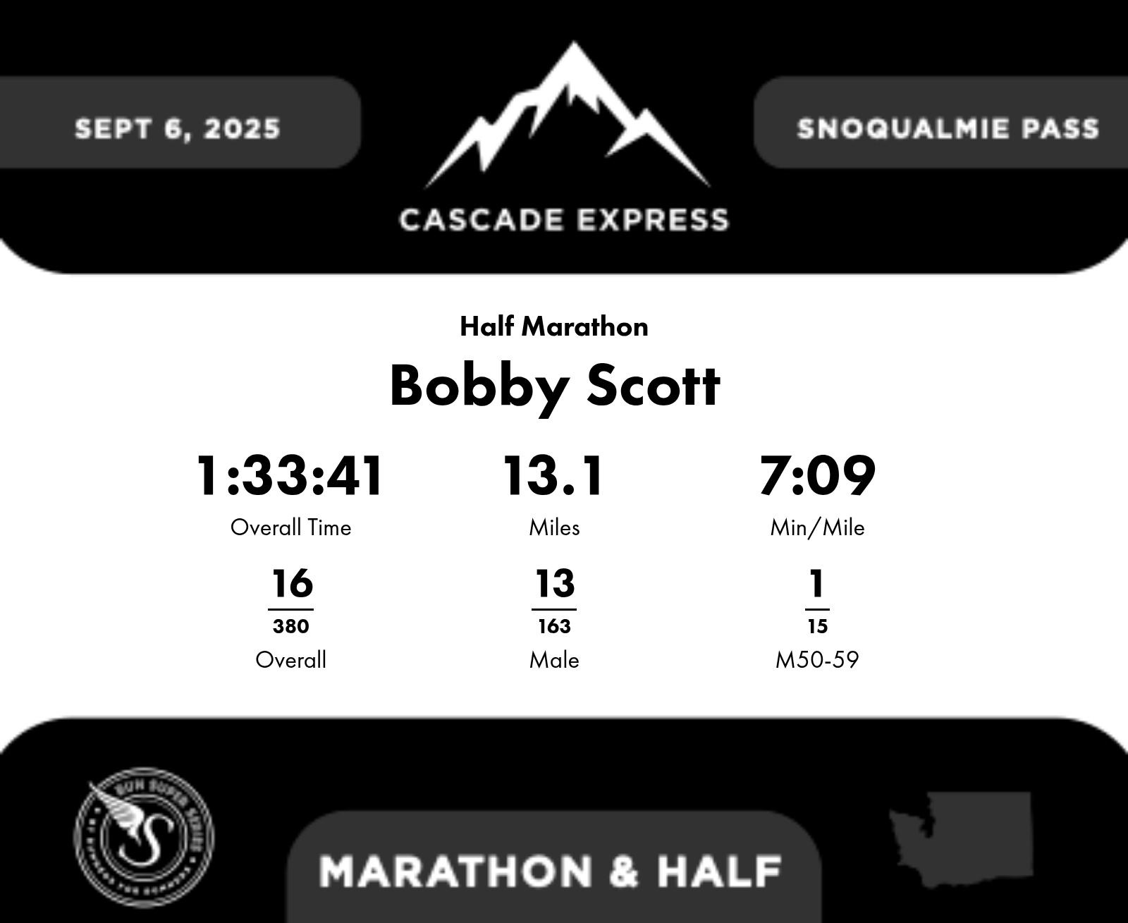 | Finish | 13.1 | 1:33:41 | 7:09/miles | 1.1 | 7:48 | 7:05/miles | 16 | 13 M | 1 M50-59 |