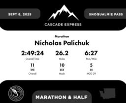 | Finish | 26.2 | 2:49:24 | 6:27/miles | 0.2 | 1:14 | 6:06/miles | 11 | 10 M | 5 M20-29 |