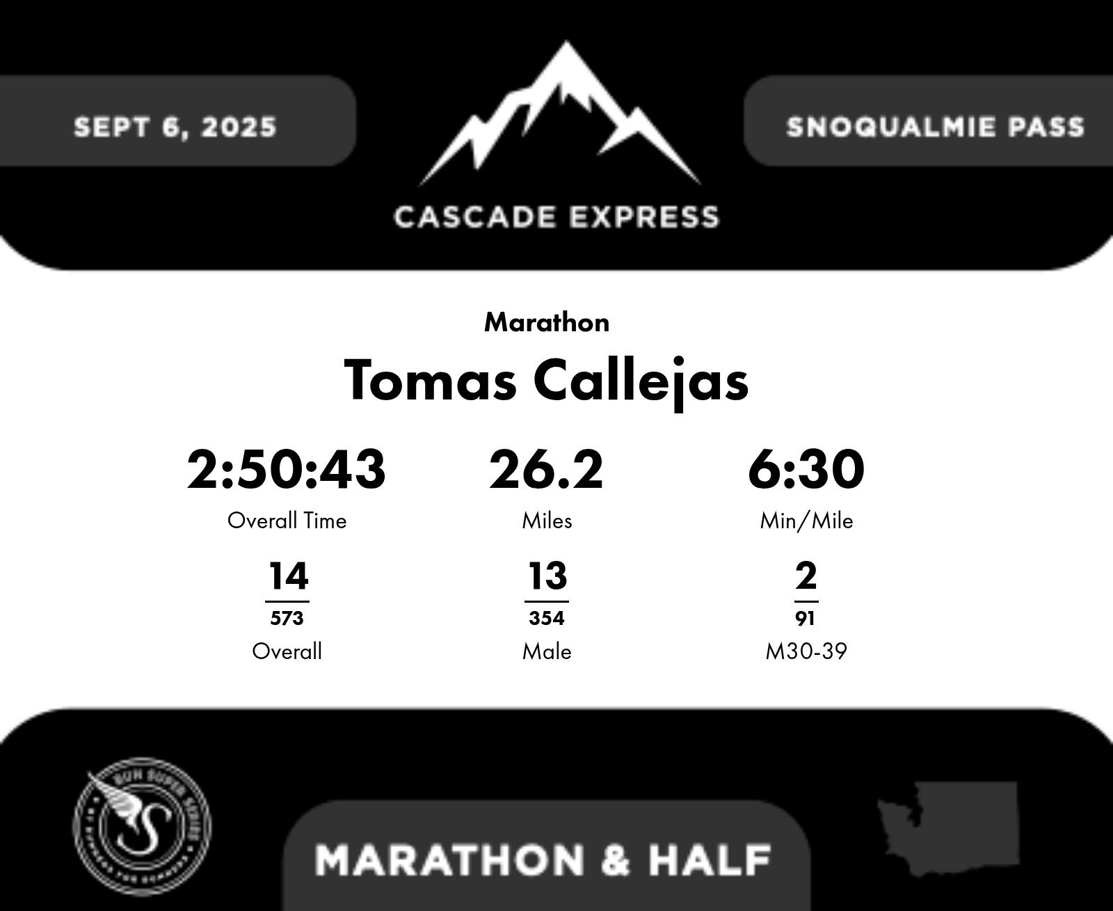 | Finish | 26.2 | 2:50:43 | 6:30/miles | 0.2 | 1:10 | 5:48/miles | 14 | 13 M | 2 M30-39 |