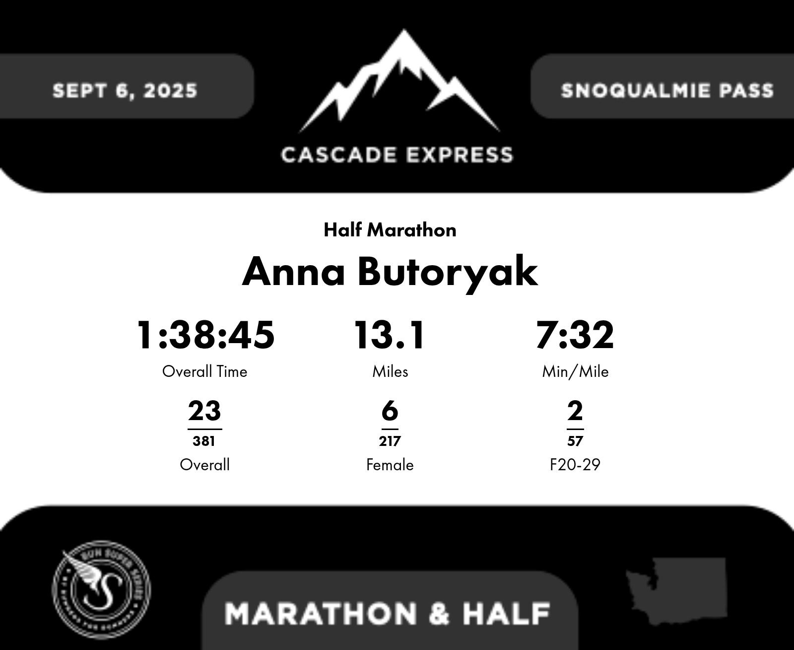 | Finish | 13.1 | 1:38:45 | 7:32/miles | 1.1 | 8:02 | 7:18/miles | 23 | 6 F | 2 F20-29 |