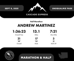 | Finish | 13.1 | 1:36:23 | 7:21/miles | 1.1 | 7:42 | 6:59/miles | 21 | 17 M | 3 M20-29 |