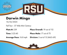 | Finish | 57.0 | 3:23:40 | 16.8 mph | 57.0 | 3:23:40 | 16.8 mph | 19 | 17 M | 3 M65-69 |