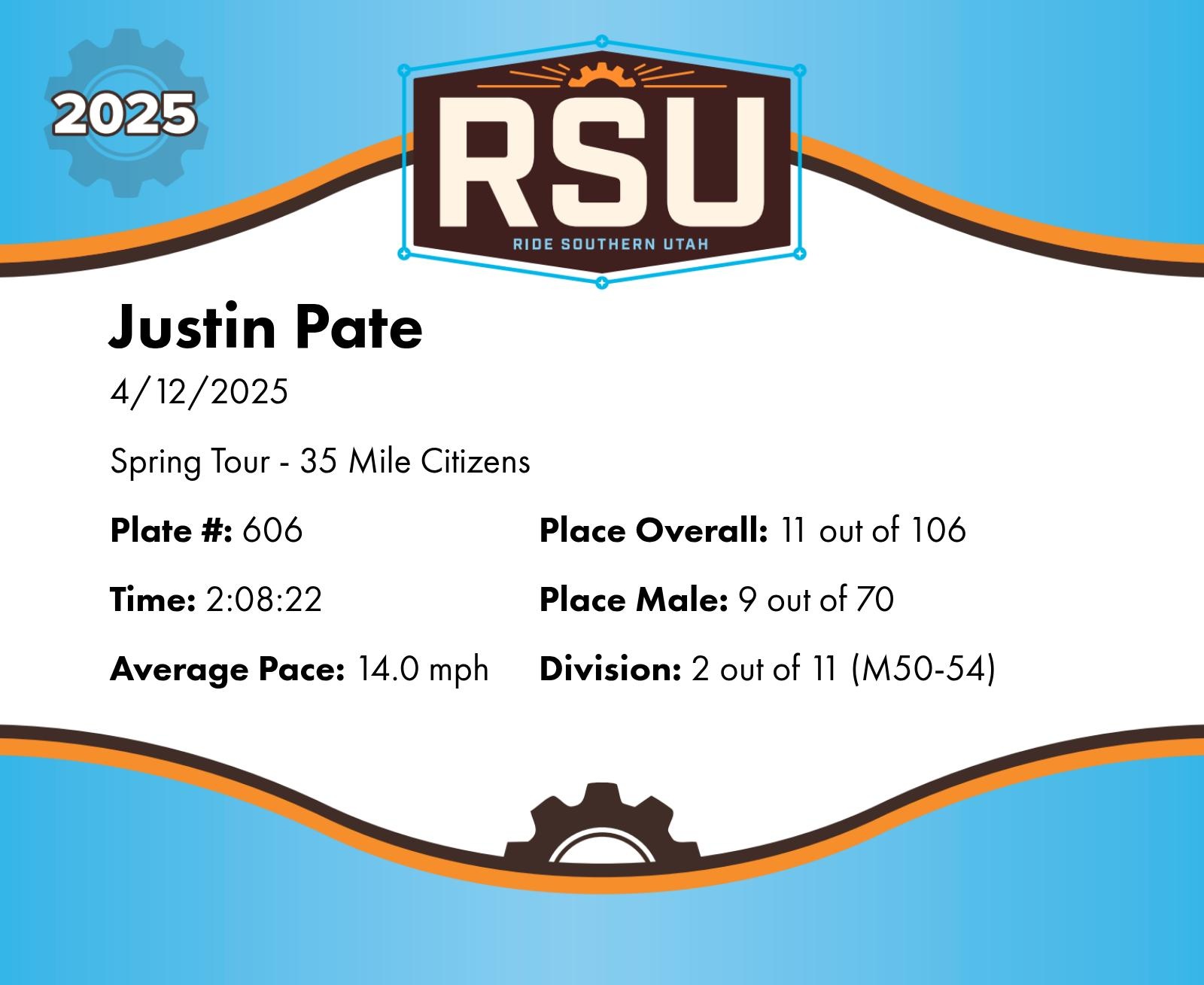 | Finish | 30.0 | 2:08:22 | 14.0 mph | 30.0 | 2:08:22 | 14.0 mph | 11 | 9 M | 2 M50-54 |