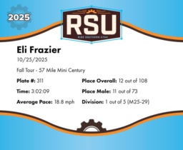 | Finish | 57.0 | 3:02:09 | 18.8 mph | 57.0 | 3:02:09 | 18.8 mph | 12 | 11 M | 1 M25-29 |
