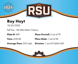 | Finish | 80.0 | 4:00:28 | 20.0 mph | 80.0 | 4:00:28 | 20.0 mph | 2 | 1 M | 1 M65-69 |