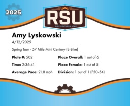 | Finish | 57.0 | 2:36:41 | 21.8 mph | 57.0 | 2:36:41 | 21.8 mph | 1 | 1 F | 1 F50-54 |