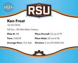 | Finish | 80.0 | 5:08:28 | 15.6 mph | 80.0 | 5:08:28 | 15.6 mph | 23 | 20 M | 3 M60-64 |