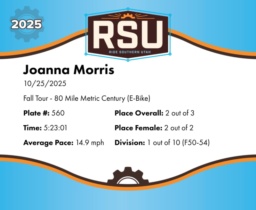 | Finish | 80.0 | 5:23:01 | 14.9 mph | 80.0 | 5:23:01 | 14.9 mph | 2 | 2 F | 1 F50-54 |