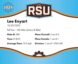 | Finish | 100.0 | 8:18:01 | 12.0 mph | 100.0 | 8:18:01 | 12.0 mph | 3 | 1 F | 1 F65-69 |