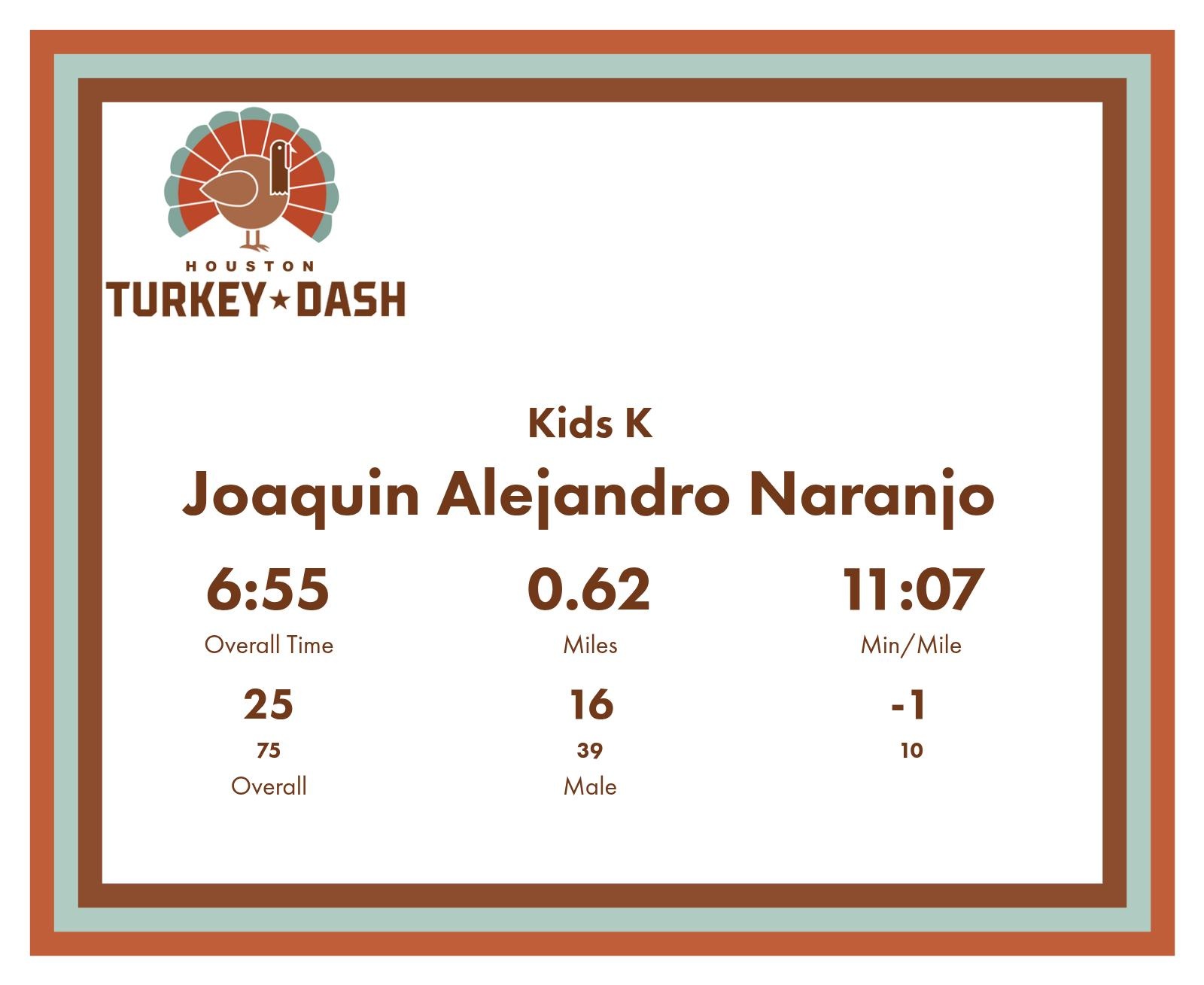 | Finish | 0.62 | 6:55 | 11:07/miles | 0.62 | 6:55 | 11:07/miles | 25 | 16 M | |