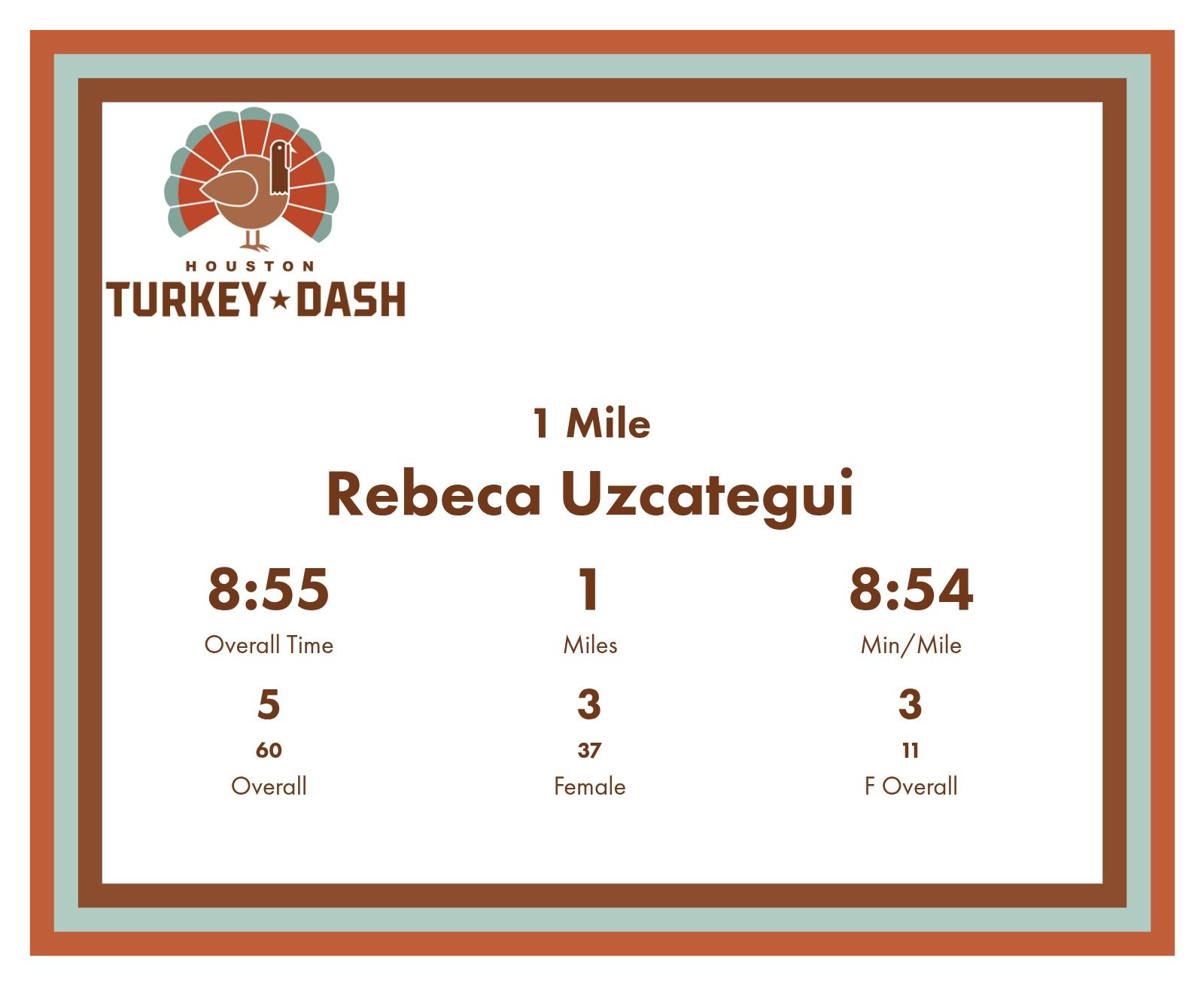 | Finish | 1.0 | 8:55 | 8:54/miles | 1.0 | 8:55 | 8:54/miles | 5 | 3 F | 3 F Overall |