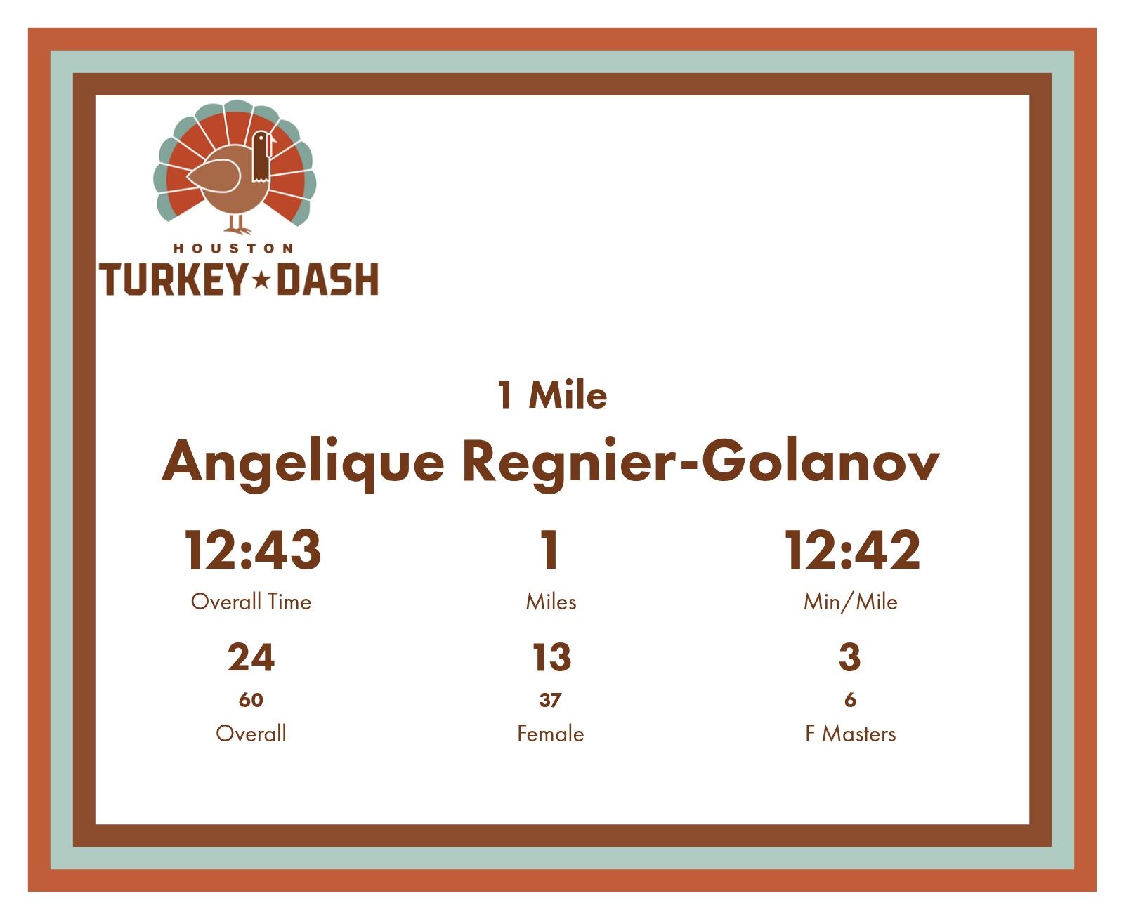 | Finish | 1.0 | 12:43 | 12:42/miles | 1.0 | 12:43 | 12:42/miles | 24 | 13 F | 3 F Masters |
