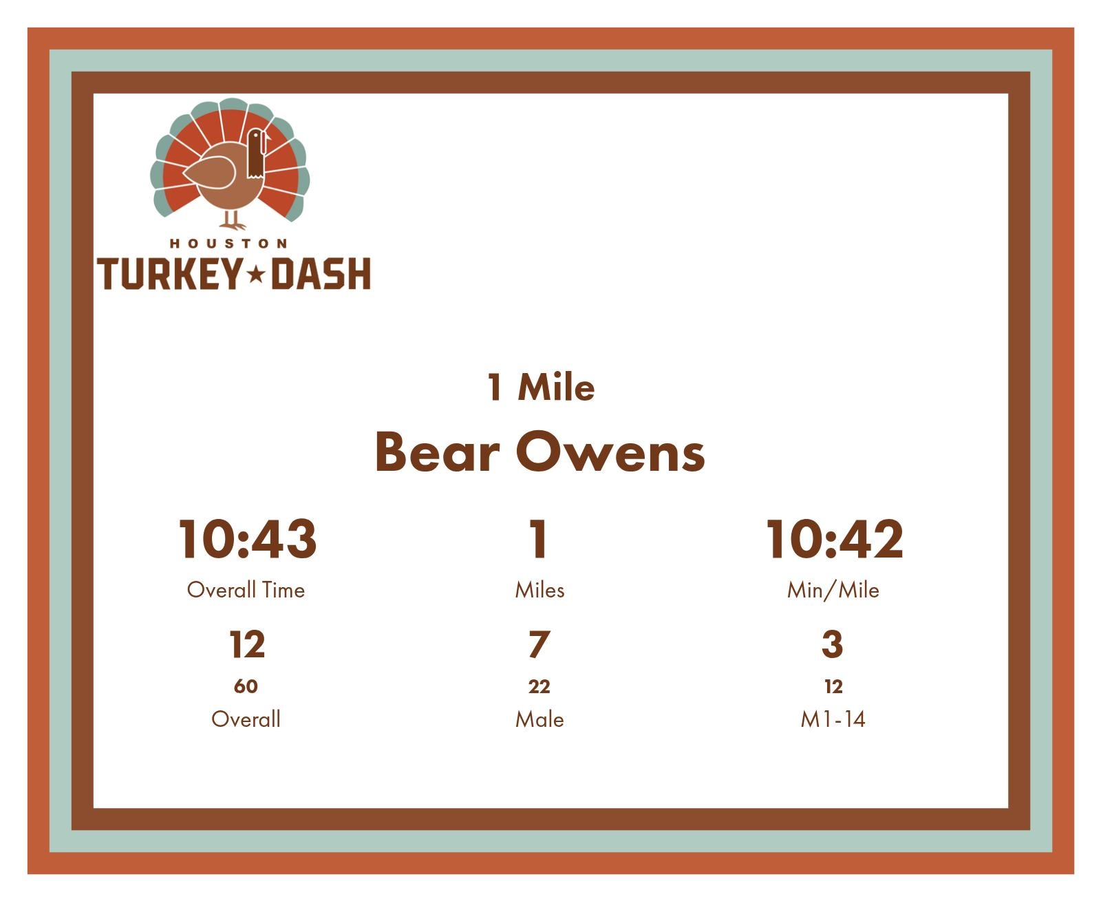 | Finish | 1.0 | 10:43 | 10:42/miles | 1.0 | 10:43 | 10:42/miles | 12 | 7 M | 3 M1-14 |