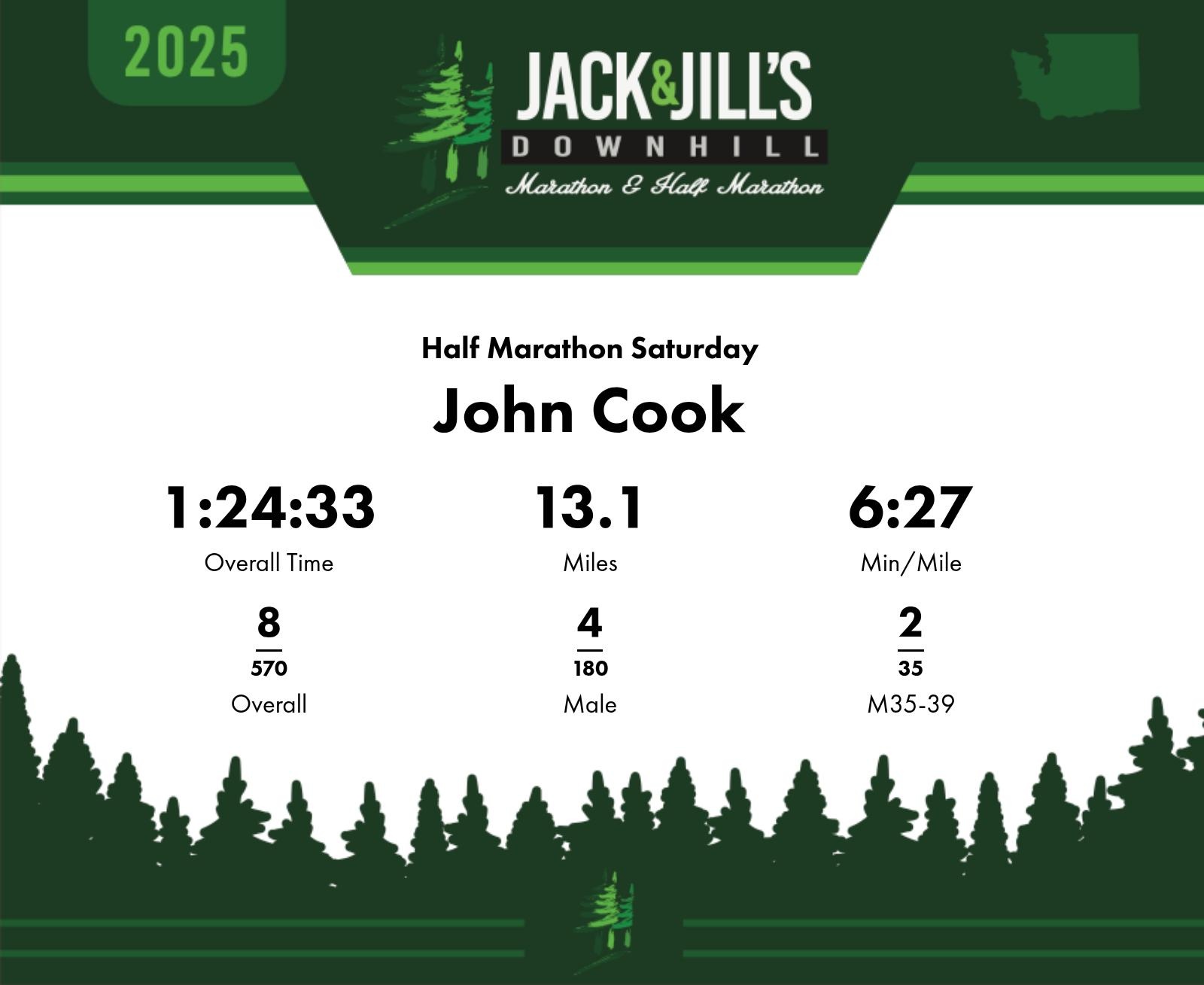 Date: July 26th & 27th Participant: John Cook #3093 Race: 2025 Jack and Jill Downhill Marathon Half Marathon Saturday Distance: 13.1 miles