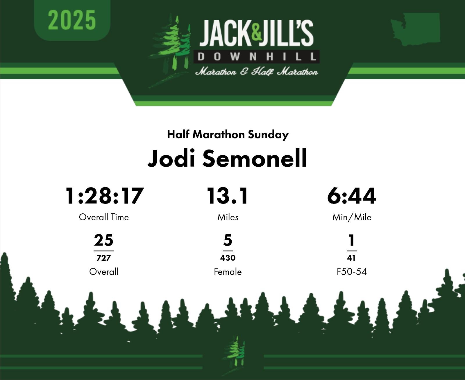Date: July 26th & 27th Participant: Jodi Semonell #7824 Race: 2025 Jack and Jill Downhill Marathon Half Marathon Sunday Distance: 13.1 miles