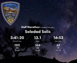 Date: Nov. 1, 2025 Participant: Soledad Solis #1361 Race: 2025 Vacation Races | Joshua Tree Half Marathon Distance: 13.1 miles